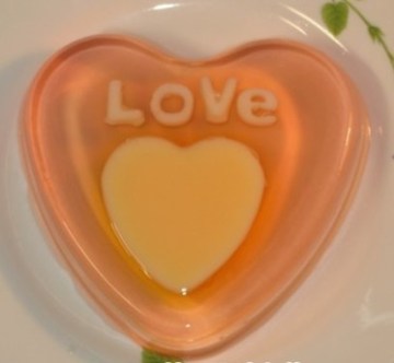 2 取布丁粉100克,冲入450毫升开水,搅拌均匀,两种果冻分别先做成一个小的心型果冻。