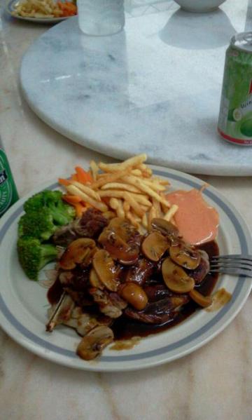 羊肉230度烤5分钟然后反面烤8~10分钟,看个人喜好口味,我个人比较喜欢烤焦点的 ,蔬菜过水捞后拿起沥干,薯条炸后放盘加上蔬菜沙拉酱,这时候羊肉应该熟了,拿起放盘,黒椒汁加热放进蘑菇,最后淋上羊肉就可以上菜了。