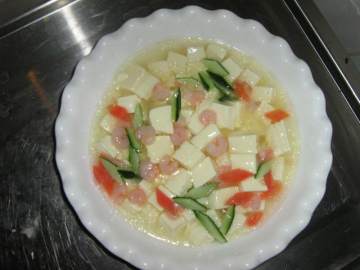 内脂豆腐,虾仁,黄瓜丁,番茄丁