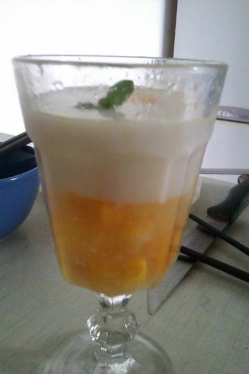 4.透明杯子底下放芒果浆。上面用引流的办法倒入杯子,可以看见颜色分明的芒果捞就做好了