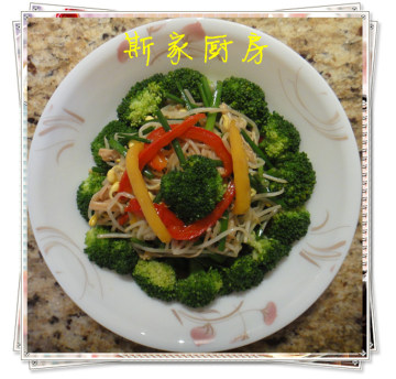 黄豆芽150克,鸡胸肉50克,水果椒50克,金针菇20克,韭苗20克,西兰花300克,香醋、油膏各适量。