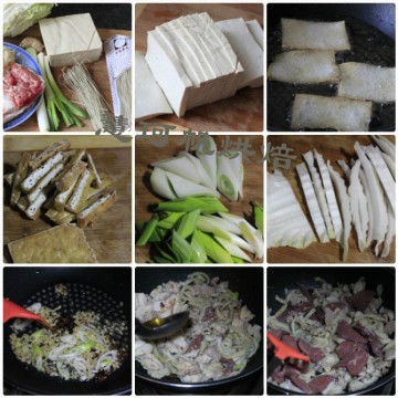 做法:1.豆腐切成1厘米厚的片,锅里放油,放入豆腐片炸成金黄色,炸豆腐需要小火慢慢炸,豆腐炸的时候容易粘连,豆腐炸到一半程度的时候,出现很多气孔,像是豆腐渣一样,再炸就成外面金黄外焦里嫩的豆腐块了。