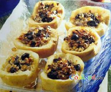 2、把糖放入锅内加热融化,另取一只大碗,将葡萄干及核桃碎仁拌匀,填入到苹果小坑内,再净糖水浇在上面。
