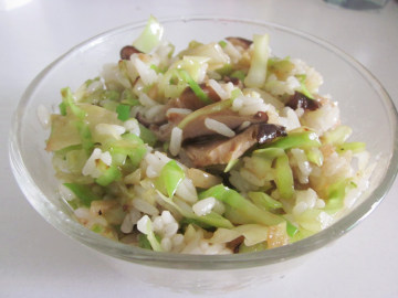 3.將蒸熟的大米倒入炒熟的包菜中拌一拌,就可以出鍋了。