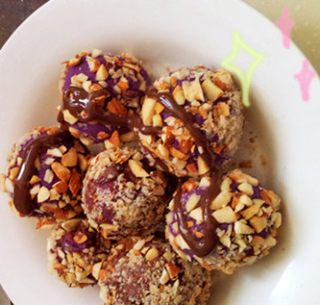 1.紫薯蒸熟,去皮捣成泥,加入牛奶使其有粘性,不会散开,把紫薯团成直径2-3cm的小球,放在盘子里备用。