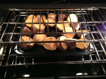 2.放入烤箱烤50分钟,至变软。取出置凉,待不烫手时,将番薯对半切开,挖出薯肉,放在大钢盆里。小心不要挖破薯皮,留下备用。同时,将烤箱温度降到160摄氏度。