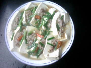 4、最后用生粉、蚝油勾芡浇在蒸好的豆腐上,再放上葱花亦可。