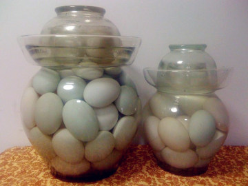 2、待盐水冷却,将洗净晾干的鸭蛋一只只地放入盐水中,并在盐水中倒入白酒一小盅,密封坛口, 30天左右即可开坛取出煮食。