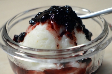 4、山药泥装入装好菊花嘴的一次性裱花袋,在杯子或容器中挤成小山状,将调好的蓝莓粒酱从上面均匀的淋下,即可食用。