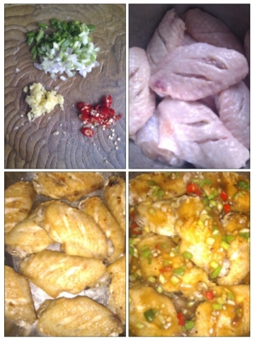 1.先把鸡翼洗干净。2.然后用刀切开它(详细见图)3.然后放少许生粉,盐,糖,腌大约20分钟。4.把锅热了放多点油,油热了把蒜蓉放进去,爆香后,再把鸡翼放到锅里(注意把面的先往锅里放,这样就不会粘住锅。)煎到金黄色就翻转过来煎另外一面,两边都煎到金黄色在把鸡翼拿起来。放到碟子里。5.最后打个芡。先把酱油,水,糖,盐,生粉,辣椒,都拌均匀了就放到锅里煮开了把鸡翼一起倒到锅里煮,然后放葱段下去。上碟即刻。