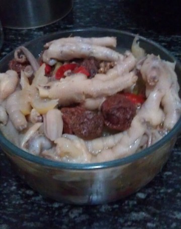 1.锅内水烧开后,加葱姜蒜、料酒,将凤爪煮软捞起沥干。