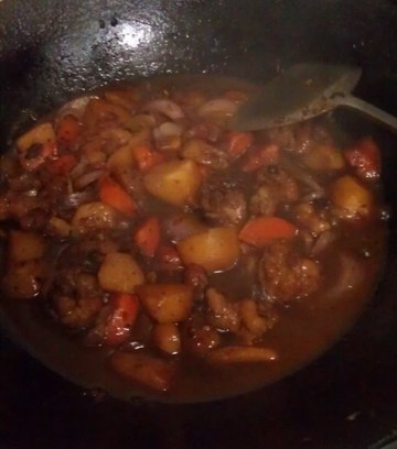 5、 倒入啤酒加盖烧开,调入老抽加土豆翻炒,小火炖10分钟。