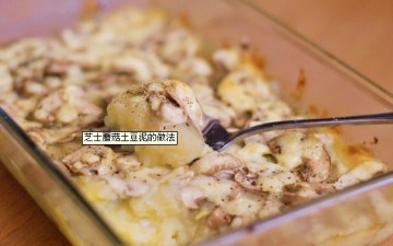 五、土豆泥倒入浅盘里,表面刮平,铺上蘑菇片。