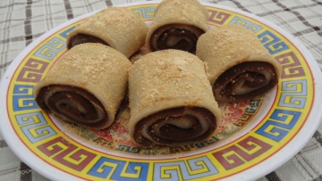 4.然后抹上赤豆沙馅(也可用红糖)卷起来,切成100克左右的小块,撒上白糖就成了。