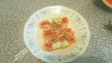 1、豆腐泡挖空,黄瓜、胡萝卜、火腿肠、西红柿切丁,胡萝卜用糖和醋小腌一下,黄瓜西红柿用沙拉酱拌一拌(具体佐料看个人喜好)