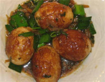 2.将猪油倒入锅内,待烧至六七成热时,将鸡蛋倒入,炸到蛋皮起泡,然后加鲜汤150毫升、料酒、酱油、糖、味精,烧滚后,改用小火烧6分钟,用旺火收浓卤汁,将鸡蛋取出 ,对剖成两半,装在盘内。
