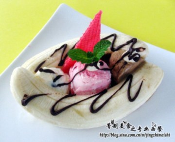 香蕉1根,冰淇淋3球,维夫饼干一片,巧克力酱少许
