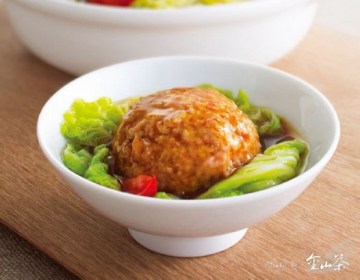 7.蒸好后青菜垫底,加膏汤.就成了狮子头.