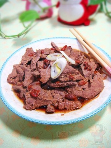 猪肝300克,枸杞20克,盐,鸡精,料酒,酱油,白糖,葱末,姜末,