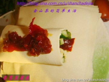 4.取一片干豆腐,放上黄瓜丝和葱丝,再放点辣椒脯或者鸡蛋酱,卷起来就可以吃啦