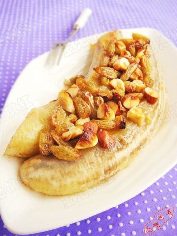4.把煎好的香蕉撒上葡萄干和干果,放入烤箱,200度烤10分钟