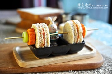 8.用一根竹签穿起蔬菜和吐司片即可