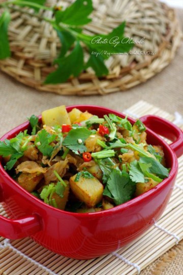 土豆2个,中型,冬菜1棵,香葱1根,香菜1棵,盐适量,鸡精少许,香油2茶匙,辣椒粉适量