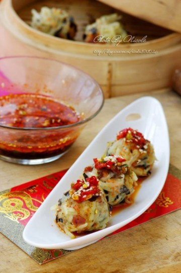 17.再将油辣子与步骤14中的调料混合,拌匀,吃时蘸食或浇在土豆丸子上即可