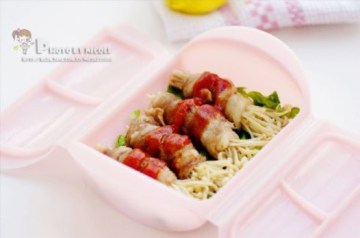 1.金针菇洗净、去掉根部,用肥牛片卷起,放入料理盒