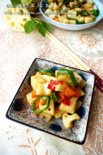 2.油锅热后,略煸蒜末、干辣椒,下尖椒、藕丁翻炒,加盐,少许米醋、胡椒粉、鸡精,炒匀片刻即起锅(中间若太干,应稍点水,保证藕丁色泽洁白)。