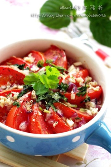2、每层番茄加少许糖,使番茄的汁水渗出,味道更佳;