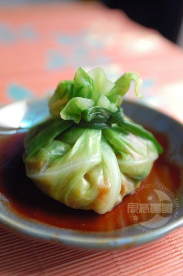 9.把包心菜叶捞出沥干水分,平铺在盘子里,放一勺炒好的蔬菜丁,包起来,用开水烫软的葱扎起来,ok了