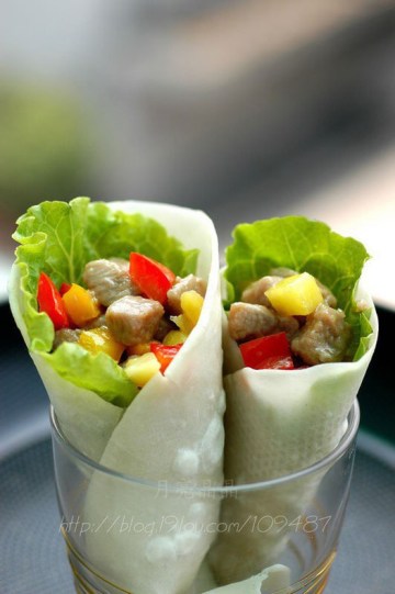 普通面粉200克,热水100克,里脊肉,彩椒,菠萝,生菜