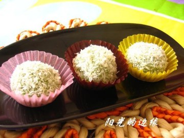 1.在糯米粉中加了一小勺小麦草粉和玉米粉,用水搅成绿色的面浆。放在微波炉里高火二分钟。拿出来搅拌一下就可以包上陷料了。最后裹上椰茸