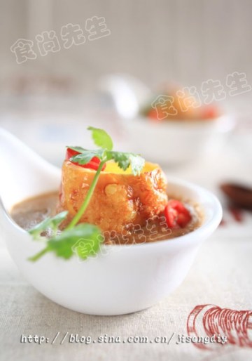 8.将酱汁盛入碗中,放入作法3的煎蛋,最后放入红辣椒及香菜装饰即可