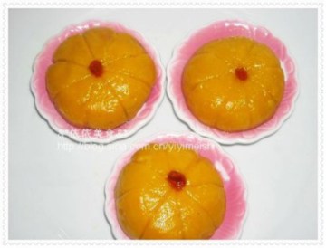 1.南瓜切薄片,蒸熟,趁热压成南瓜泥