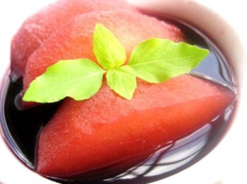 2.红酒加冰糖、柠檬片煮沸,下入雪梨加热至微沸,倒入容器冷却