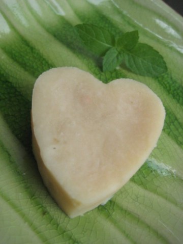 4、分别取两种各25克搓成小球,压成饼,用模子制成心形,叠在一起