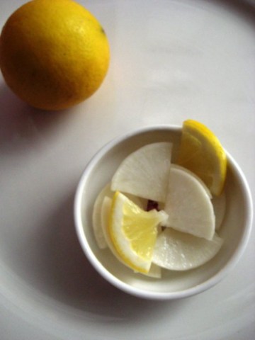 5.将糖,白醋,柠檬汁,柠檬片混合白萝卜拌均匀