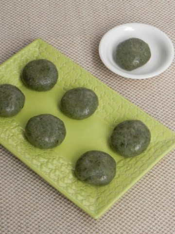1.粉类混合,加艾叶(汁)边加热水边搅,不烫时用手和成团