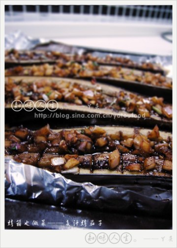 8.将调好的汁浇在茄子上,放入烤箱再烤几分钟,蒜和洋葱基本熟了即可