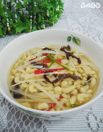 4.用筷子把面粉与温水搅拌混合,形成湿性的面疙瘩