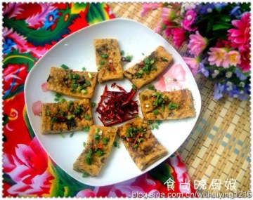 1.北豆腐切2厘米厚的薄片,热锅中倒入3汤勺植物油,油温成热时放入豆腐煎3分钟翻面