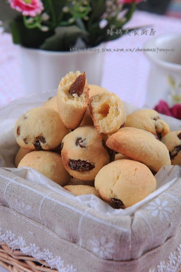 3.用手或用刮刀将葡萄干面团拌匀,将面团一个个分搓成大约12克左右重的圆球或椭圆形,铺在垫了油纸的烤盘上,烤箱预热160度,中层,上下火烤约30分钟左右至熟即可