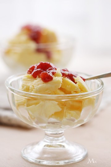8.将冰激凌舀入冰激凌碗,淋上自己做的草莓果酱就可以享受咯