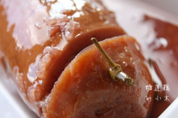2.将作法1的莲藕放入水中煮约4小时,再焖4小时后取出,切0.5∼1公分厚,放入适中的容器内,加入冰糖、桂花,蒸40∼50分钟直到冰糖溶解即可取出食用。