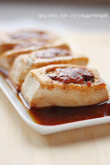 2.把豆腐中间挖空,把搅拌好的馅料酿入其中。