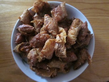 新鲜肉剁成肉泥,加老酒,盐,菜,加鸡蛋和面粉。包在豆腐皮,剪成小段,用油炸。