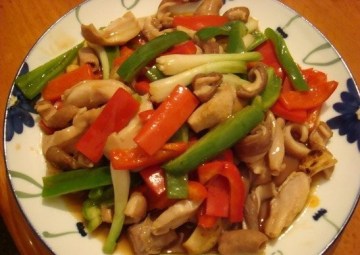 7、炒锅回放火上,先放青红椒然后下蒜、姜、葱,爆香,下肚蒂块,烹黄酒,用芡汁勾芡,加熟猪油炒匀,装盘,迅速上桌。