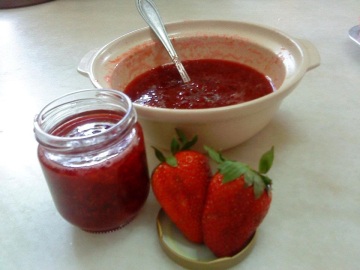 3.准备干净、无水的玻璃容器,待果酱温度降为80℃左右,装瓶,密封,储存于低温环境中。(关于果酱装瓶时的温度,俺上网查了,有的说高温80℃左右为好,可起到杀菌的作用;也有说放凉之后再装瓶的。俺选择了前者,实践效果表明草莓果酱滴状态良好,或许和高温装瓶杀菌有点关系。)